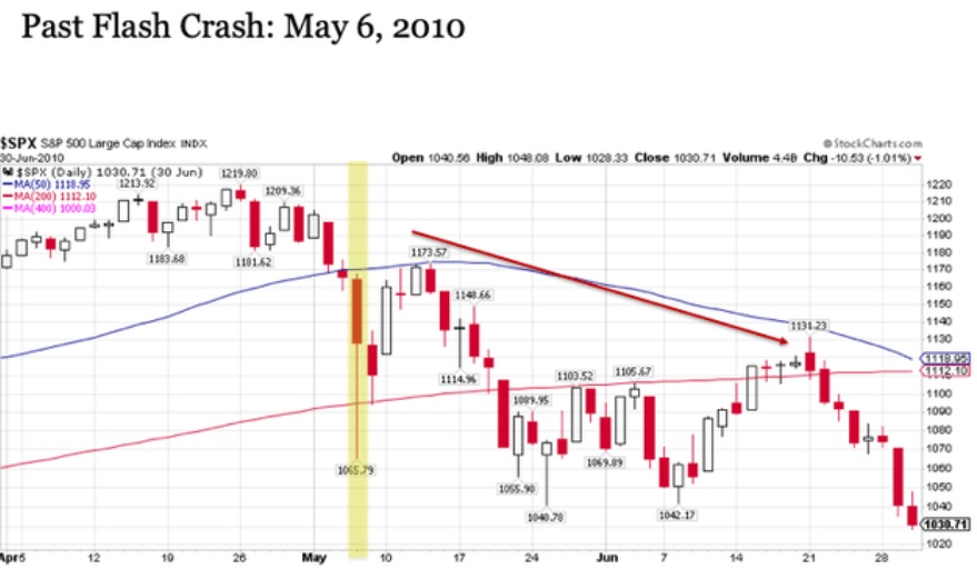 2010年5月6日,标普500指数突然暴跌近10%,随后迅速站稳脚跟,在交易日结束时收复了大部分失地。尽管标普500指数最终在5月中旬一路上涨,但50日移动均线却因闪电崩盘而被彻底打破,最终导致股市在重新测试这一关键阻力位时失败,然后回档下行。事实证明,5月6日的闪电崩盘预示着最终持续到6月底的进一步下跌。当时,美联储刚刚结束了它的第一个量化宽松计划,这让股市失去了投资者多年来熟悉并沉迷其中的流动性支柱。