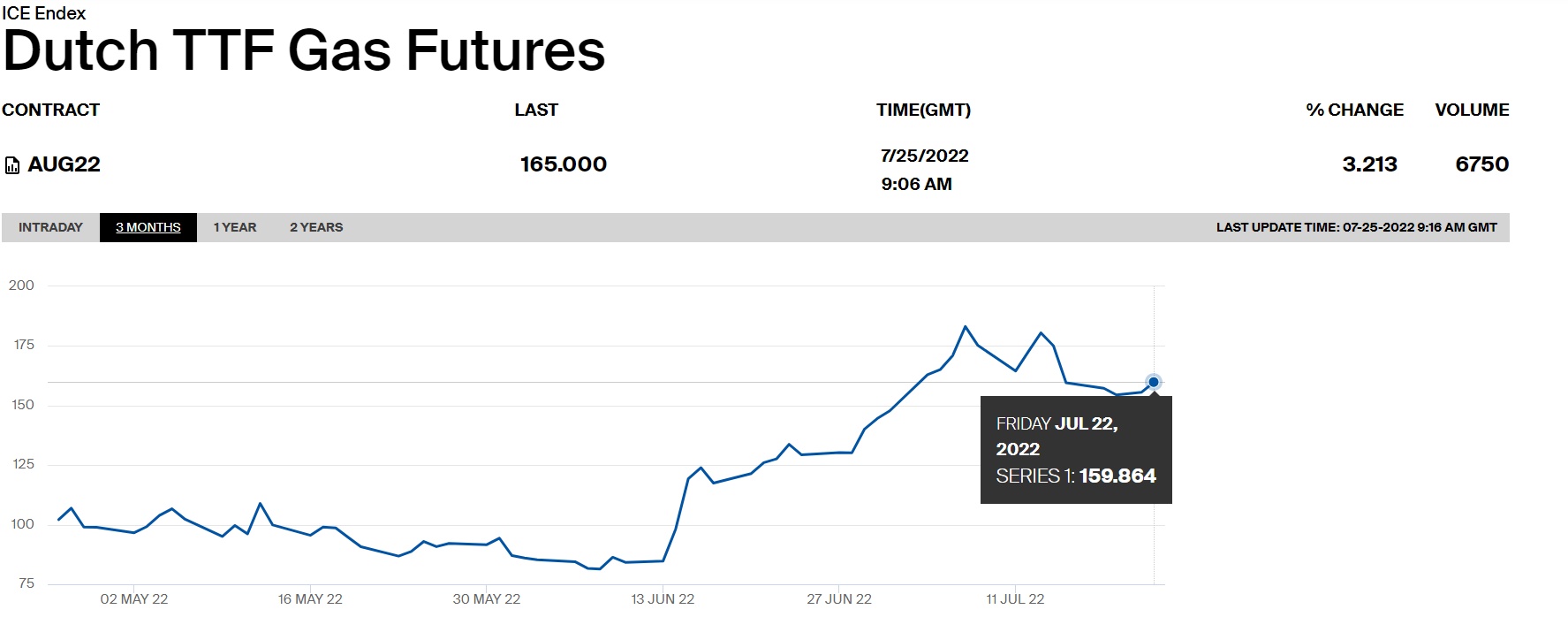 智通财经APP获悉,由于通过俄罗斯一条主要管道输送至德国的未来天然气输送量仍然具不确定性,欧洲天然气价格连续第四个交易日实现上涨。虽然在7月21日结束维护之后,北溪1号(Nord Stream)天然气输送管道输往德国的天然气一直以40%的输送量进行输送,但俄罗斯总统普京在上周警告称,如果无法及时接收滞留在运输途中的这一涡轮机,以替换另一个可能需要维修的涡轮机,这一比例可能将降至20%。