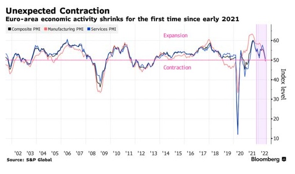 今年冬天天然气配给制的前景使已经摇摇欲坠的信心雪上加霜。伴随着持续的供应链中断和欧元问世以来最快的通胀,人们对欧元区经济衰退的担忧正在加剧。