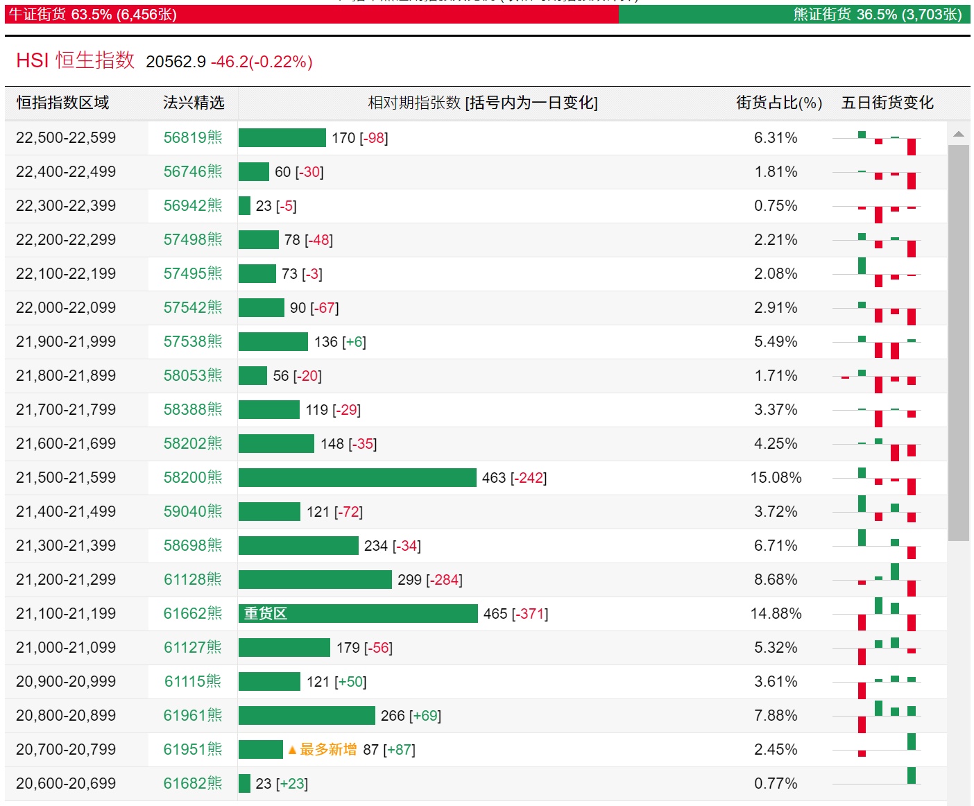 法兴恒指牛熊证街货分布图中的数据显示,熊证街货重货区在21100-21199区间,该区间最新熊证数量为465张,较上一交易日减少371张;最多新增在20700-20799区间,该区间最新熊证数量为87张,较上一交易日增加87张。