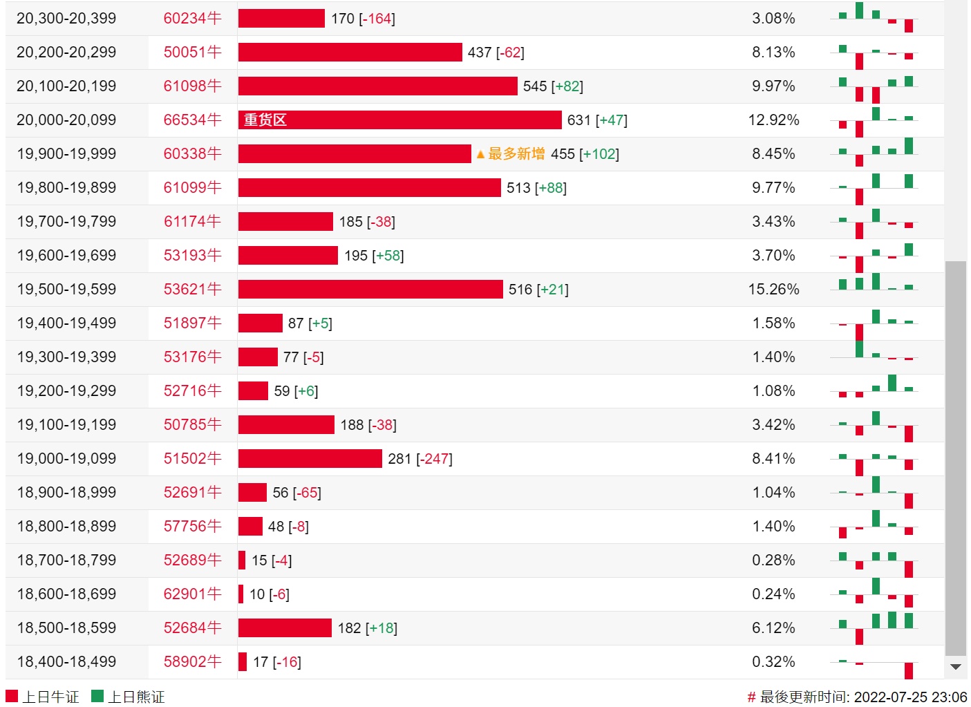 牛证街货重货区在20000-20099区间,该区间最新牛证数量为631张,较上一交易日增加47张;最多新增在19900-19999区间,该区间最新牛证数量为455张,较上一交易日增加102张。