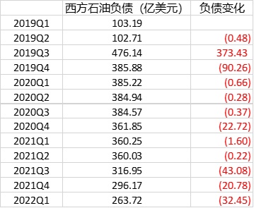回看西方石油财报,该公司在财报中从2021年Q2起开始提出近期到中期内将负债降至200亿美元,并在2022年Q1财报中,明确提出将在近期偿还50亿美元债务,将其负债降至200亿美元,在中期以高双位数降低负债,并在长期内到期时偿还债务。