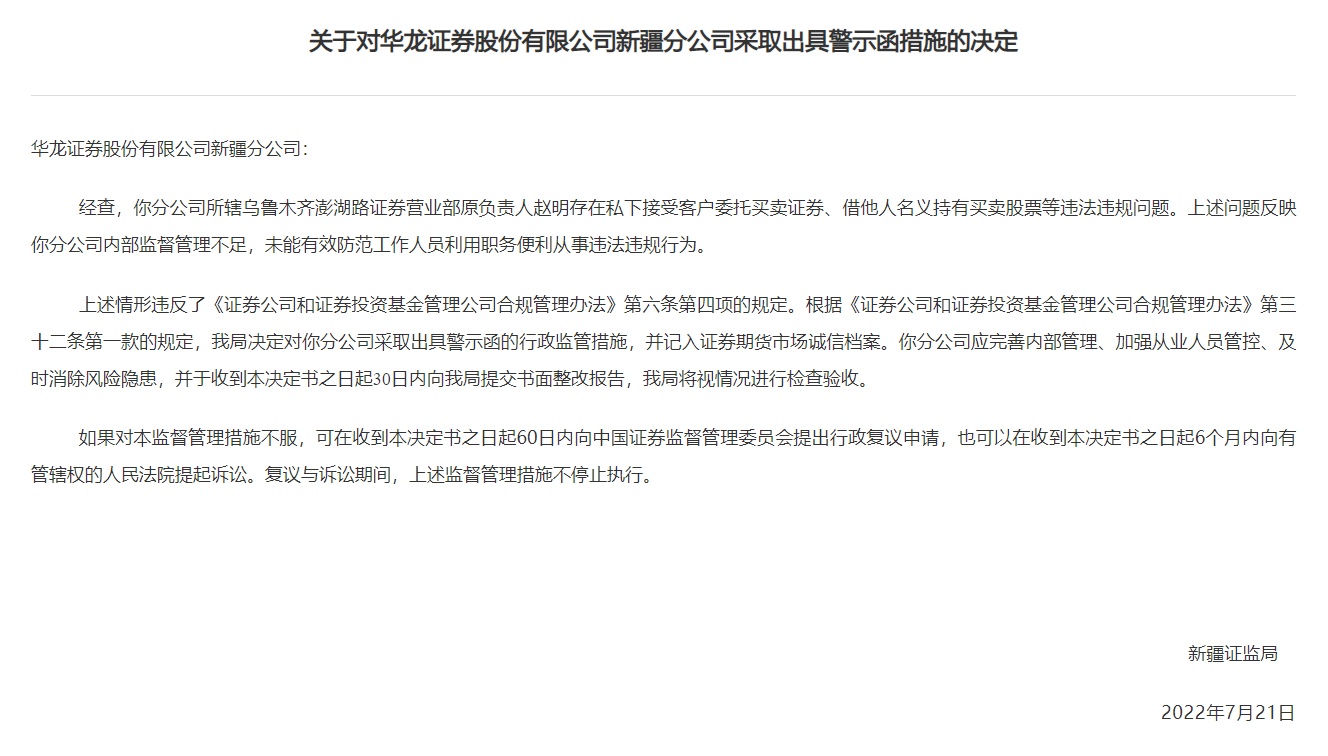 公告显示,作为营业部负责人,华龙证券营业部负责人赵明不仅私下接受客户委托买卖证券,还假借他人名义持有、买卖股票,存在违规操作客户证券账户的行为,因此被新疆证监局采取监管谈话的行政措施,此外,华龙证券新疆分公司也因此收警示函,并记入证券期货市场诚信档案。