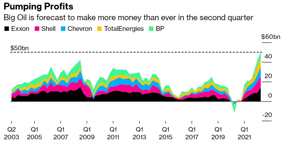 智通财经APP获悉,大型石油公司将在第二季度实现创纪录的500亿美元利润,但该行业的出色表现可能包含其自身衰落的种子。石油产商盈利飙升是能源价格高企的直接结果。能源价格高企加剧了通胀,加大了消费者的压力,提高了经济衰退的风险,并引发了征收暴利税的呼声。在这种政治和经济动荡中,股东可能不得不降低他们对回报上升的预期。