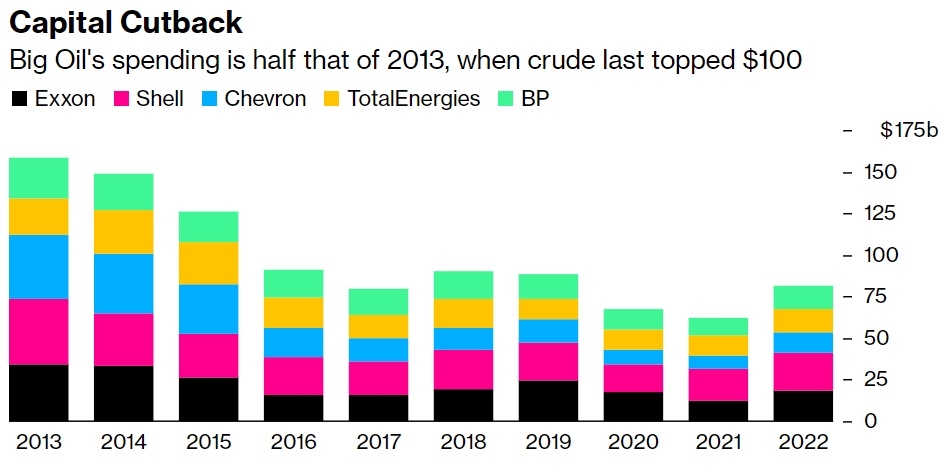 天价般的利润不仅仅是大宗商品价格普遍上涨的结果。与上一次油价高于每桶100美元时相比,大型石油公司的支出也少了很多。今年的资本支出预计将攀升至800亿美元,但这只是2013年水平的一半。