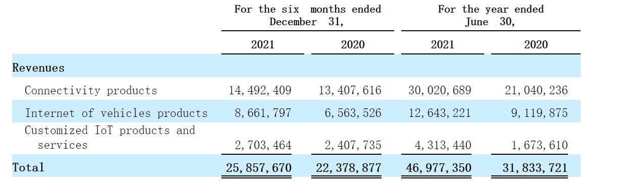 从招股书来看,物芯控股的收入主要来源于三大板块,分别是连接产品、车联网产品、以及定制的物联网产品和服务。其中,连接产品指的是主要来自芯片、模组、天线等产品的销售,在该业务中,物联网芯片以及汽车天线是业务增长的关键驱动力。2021年下半年,连接产品的收入占比为56%。