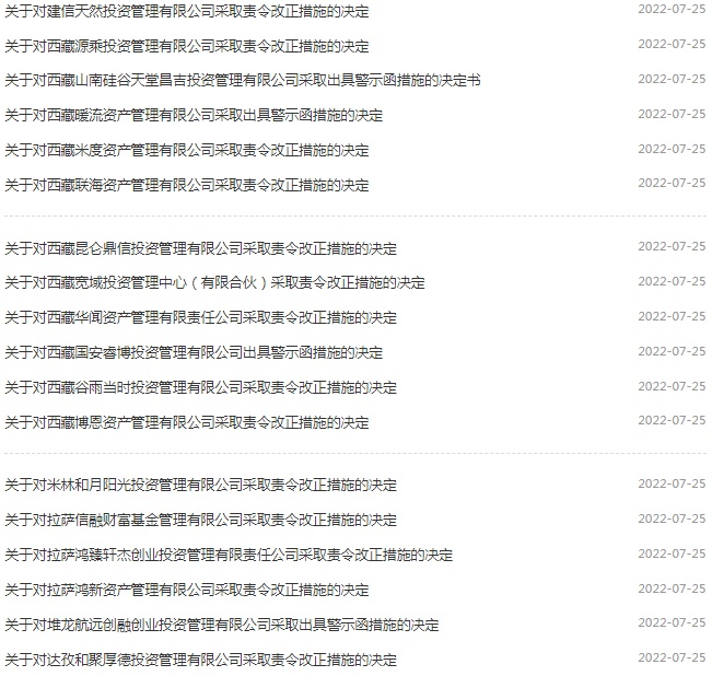 智通财经APP获悉,7月25日,西藏证监局对私募基金一次性开出19张罚单!具体来看,19张罚单中有6张罚单在2020年年末,13张罚单在2019年。其中西藏暖流资管、西藏山南硅谷天堂昌吉、西藏国安睿博、堆龙航远创融创业4家私募基金被出具警示函,另外15家私募则被责令改正。
