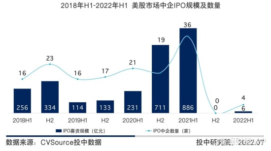 据统计,2022年上半年,仅4家中企在美国资本市场IPO,IPO数量同比下降88.89%,募资金额共计6亿元,同比降低99.32%。受到美国证监会将部分中概股列入“预摘牌清单”的影响,至2022年5月初,中概股总市值已较年初下跌31%,远远高于同期美股15%的跌幅。