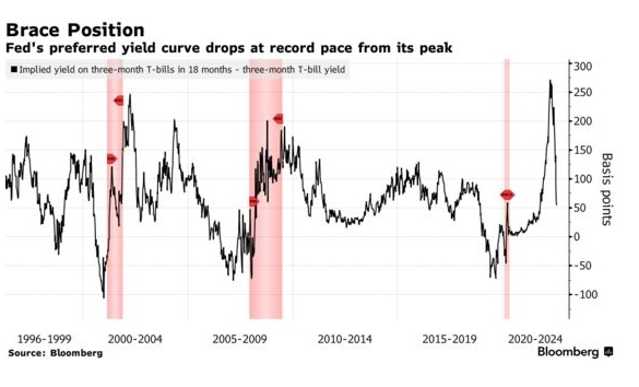 在鲍威尔发表上述言论后不久,这二者的收益率息差就达到了峰值,但现在正迅速下降,足以在下个月的某个阶段跌至零以下。