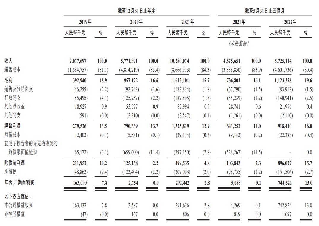 据洪九果品聆讯后更新版本的招股书数据显示,于2019年至2021年截至12月31日止年度,公司收益分别约为人民币20.78亿元、57.71亿元及102.80亿元,期内利润分别约为人民币1.63亿元、275.40万元、2.92亿元。此外,于2021年至2022年截至5月31日止五个月,公司收益分别约为人民币45.76亿元及57.25亿元,期内利润分别约为人民币508.80万元、7.45亿元。