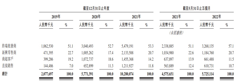 洪九的前五大客户为终端批发商、新兴零售商及商超客户,于2021年至2022年截至2022年5月31日止五个月,终端批发商贡献收入人民币23.39亿元、32.68亿元,占各期间总收入的51.1%、57.1%;新兴零售商贡献收入人民币10.35亿元、11.85亿元,占各期间总收入的22.6%、20.7%;商超客户贡献收入人民币6.38亿元、6.61亿元,占各期间总收入的13.9%、11.5%。