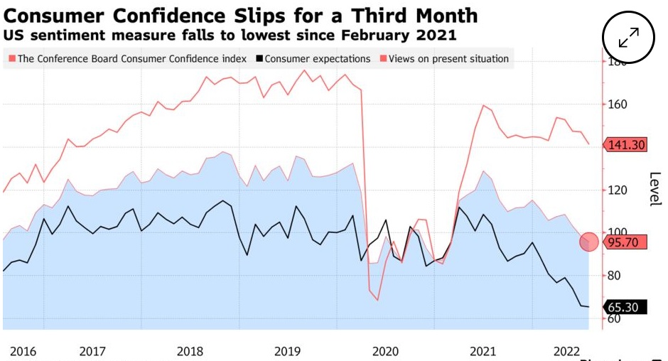 谘商会经济指标高级主管Lynn Franco在一份声明中表示:“对通胀的担忧——尤其是不断上涨的天然气和食品价格——继续给消费者带来压力。展望未来,通胀和进一步加息可能会在未来六个月继续对消费者支出和美国经济增长构成强劲的阻力。”