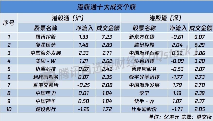 南向资金昨日净流入10.12亿港元。港股通(沪)方面,中国海外发展、复星医药净买入居前,分别获净买入2.33亿港元、1.48亿港元。港股通(深)方面,腾讯控股、快手-W净买入居前,分别获净买入2.04亿港元、1.87亿港元。