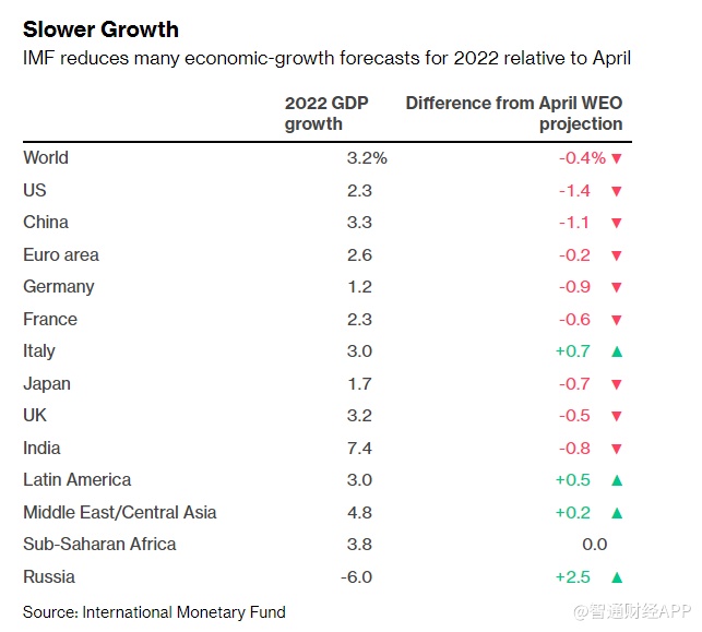 IMF还大幅下调了美国经济增长预期。由于今年早些时候增长放缓、家庭购买力下降和货币政策收紧,IMF将美国今年经济增长预期下调至2.3%,较4月份的预期低了1.4个百分点。