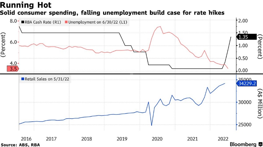 澳大利亚并不是唯一一个在与通胀作斗争的经济体。市场预期美联储本周将加息75个基点,以减轻通胀压力。从英国到新西兰,各大央行也在加息,以控制飙升的通胀。