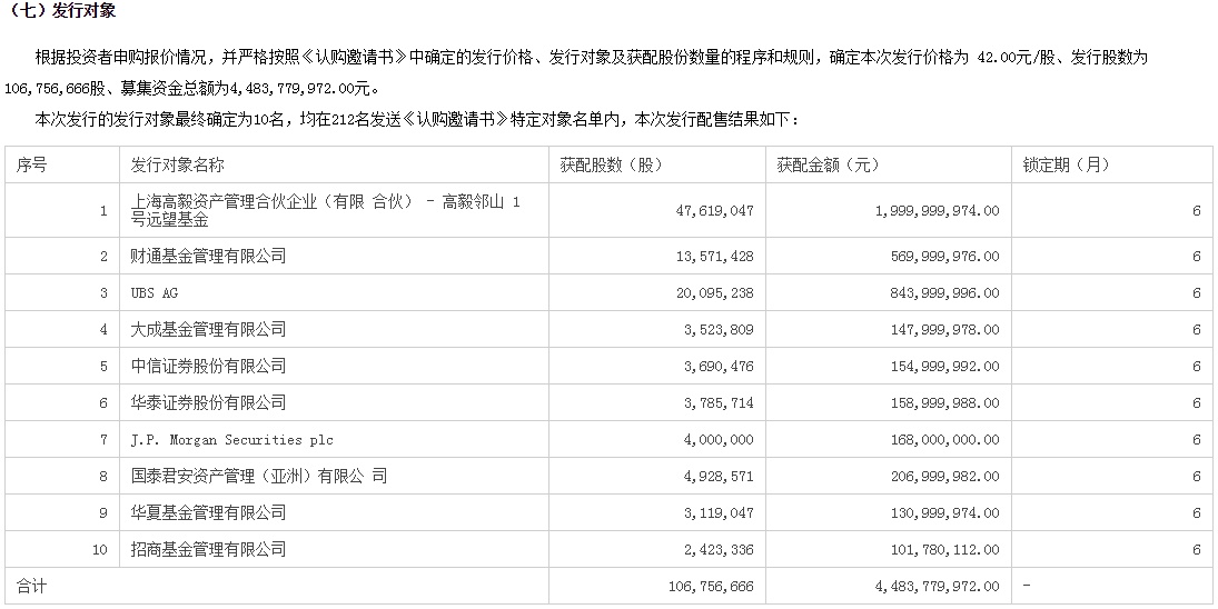 此外,大成基金、中信证券、华泰证券、小摩、国泰君安资管(亚洲)公司、华夏基金、招商基金等机构获配股数也均超200万。