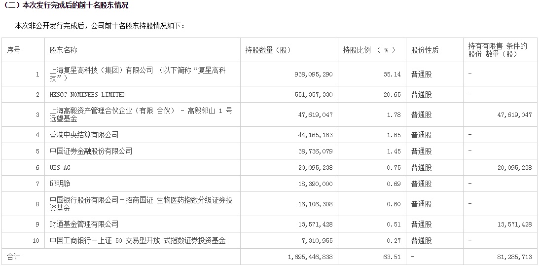 复星医药还称,此次发行前,公司已严格按照法律法规的要求,建立了完善的公司治理结构。此次发行后,公司的控股股东及实际控制人未发生变更,此次发行不会对公司现行法人治理结构产生重大影响,公司将继续加强和完善法人治理结构。公司高级管理人员不会因此次发行而发生变化。