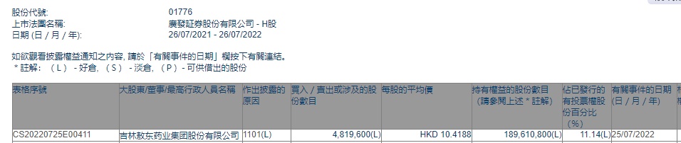 智通财经APP获悉,香港联交所最新资料显示,7月25日,吉林敖东(000623.SZ)增持广发证券(01776)481.96万股,每股作价10.4188港元,总金额约为5021.44万港元。增持后最新持股数目约为1.90亿股,最新持股比例为11.14%。