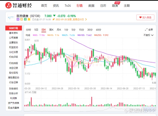 尽管公司营收增速亮眼,资本市场的医美板块也相对活跃,但医思健康的股价并未有所表现,截至收盘时间,公司股价跌0.98%,报收7.08港元/股。