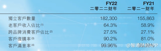 按客户来看,老客户占比持续提升,2022财年老客户收入占比达到64.3%,较去年增长5.4个百分点。客户复购率也从去年的81%增长至今年的90.2%。