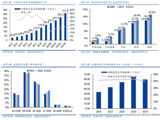 根据艾瑞咨询《2020年中国医疗美容行业洞察白皮书》数据,2019年中国已成为全球医疗美容服务第二大国,医美市场规模达1769亿元,2015-2019年期间CAGR达28.54%,预计至2025年市场规模有望达3115亿元,期间CAGR达15.19%。前瞻产业研究院数据测算2020年中国大陆医疗美容渗透率仅3.9%,香港地区医疗美容渗透率仅5.2%,对标医美成熟的日美韩市场,我国医美渗透率提升仍有3-4倍增长空间。