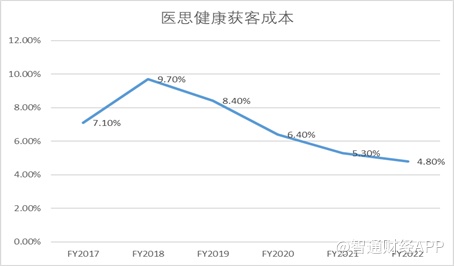 此外公司亦推出了包含旗下所有品牌讯息及相关服务的一站式医疗APP,可实现对顾客的反复触达和交叉引流,并通过会员计划将顾客转化为忠诚度较高的私域流量,进一步实现高效获客。因此,医思健康的获客成本远低于行业平均水平,且逐年向下,至2022财年,公司获客成本仅占营收4.8%。