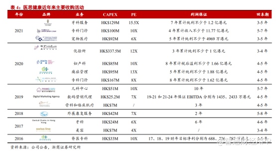在外延并购及后续整合方面,医思健康遵循以下思路:(1)横向拓展卡位高景气+高复制性医疗专科赛道,注重与已有业务的协同效应,布局体检、牙科、眼科等消费医疗项目。(2)并购策略较为稳健,收购市盈率多控制在10X以下,并进行利润保证。(3)对于并购资产精细化运营,在基于数码科技平台进行流程重组和运营优化的同时,充分利用公司现有资源赋能发展。近年来公司主要收购标的投资回收期多控制在5年左右。