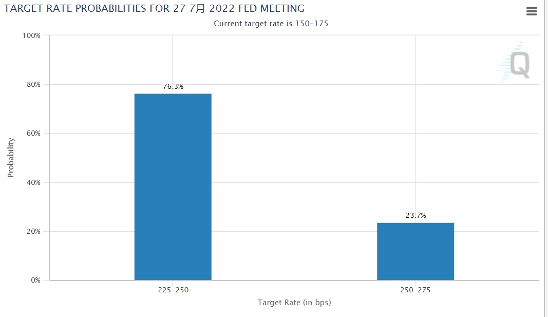 近期,芝加哥商品交易所(CME)的美联储观察工具(FedWatch tool)预测,在7月会议上加息75个基点概率为76.3%,加息100个基点的概率为23.7%;就9月份而言,市场预计在此基础上加息50个基点的可能性为49.6%,加息75个基点的可能性为42.0%。