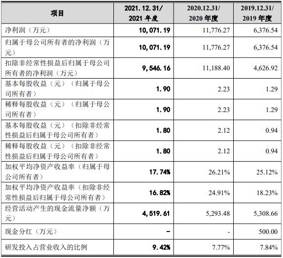 据紫建电子招股书中介绍,公司当前盈利能力良好。2019年、2020年和2021年,公司营业收入分别约为4.2亿元、6.39亿元和7.99亿元,实现净利润分别约为6,376.54万元、1.18亿元和1.01亿元。此外,公司持续投入技术创新,研发投入逐年增加,报告期内研发费用占营业收入的比例分别为7.84%、7.77%和9.42%。