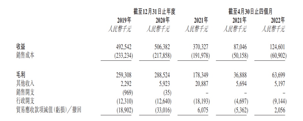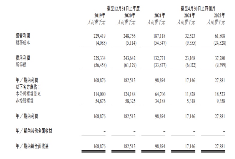 截至2021年12月31日止三个年度及截至2022年4月30日止四个月,公司的收益分别约为人民币4.925亿元、5.064亿元、3.703亿元及1.246亿元。同年╱期利润分别约为人民币1.689亿元、1.825亿元、0.989亿元及0.279亿元。