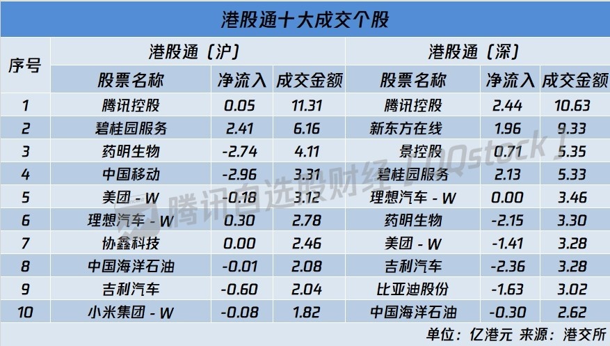 南向资金昨日净流入2.74亿港元。港股通(沪)方面,碧桂园服务净买入2.41亿港元,理想汽车-W净买入0.30亿港元。港股通(深)方面,腾讯控股净买入2.44亿港元,碧桂园服务净买入2.13亿港元。