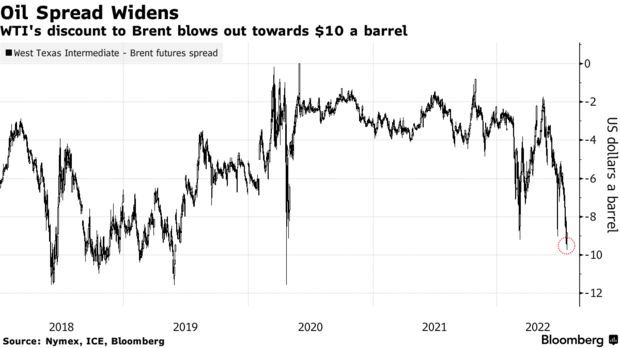另一个关键因素在于,WTI原油与布伦特原油期货之间的价差不断扩大。周三,WTI原油期货价格较布伦特原油期货价格低逾9美元,创下自2020年原油价格一度出现负值以来的最大盘中价差,原因是欧洲争先恐后地更换俄罗斯的原油供应导致布伦特原油期货价格上涨,而WTI原油期货价格则继续受到战略石油储备释放和燃料消费疲软的压制。