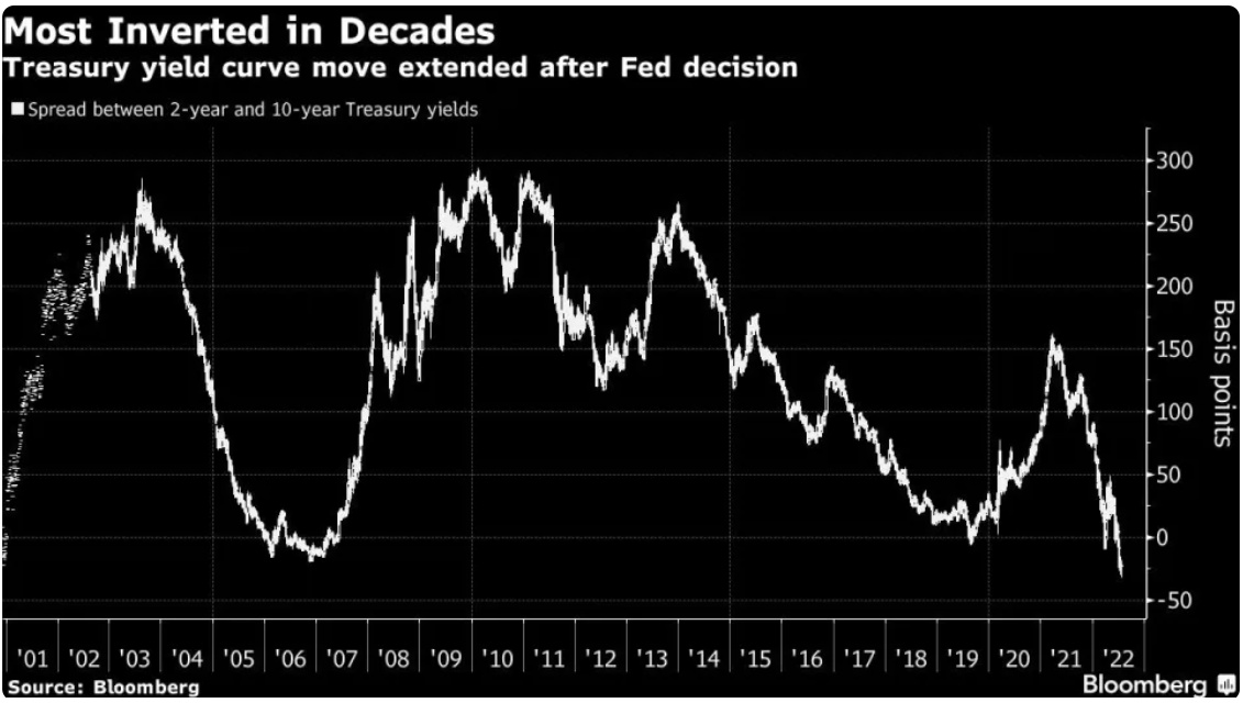 在美联储宣布将基准利率上调75个基点后,十年期国债收益率下滑。当日早些时候,收益率曲线倒挂指标已经处于数十年来的低点,但在美联储最新政策发布后又达到一个新的极限。美债收益率曲线倒挂通常被视为经济衰退风险的潜在指标。
