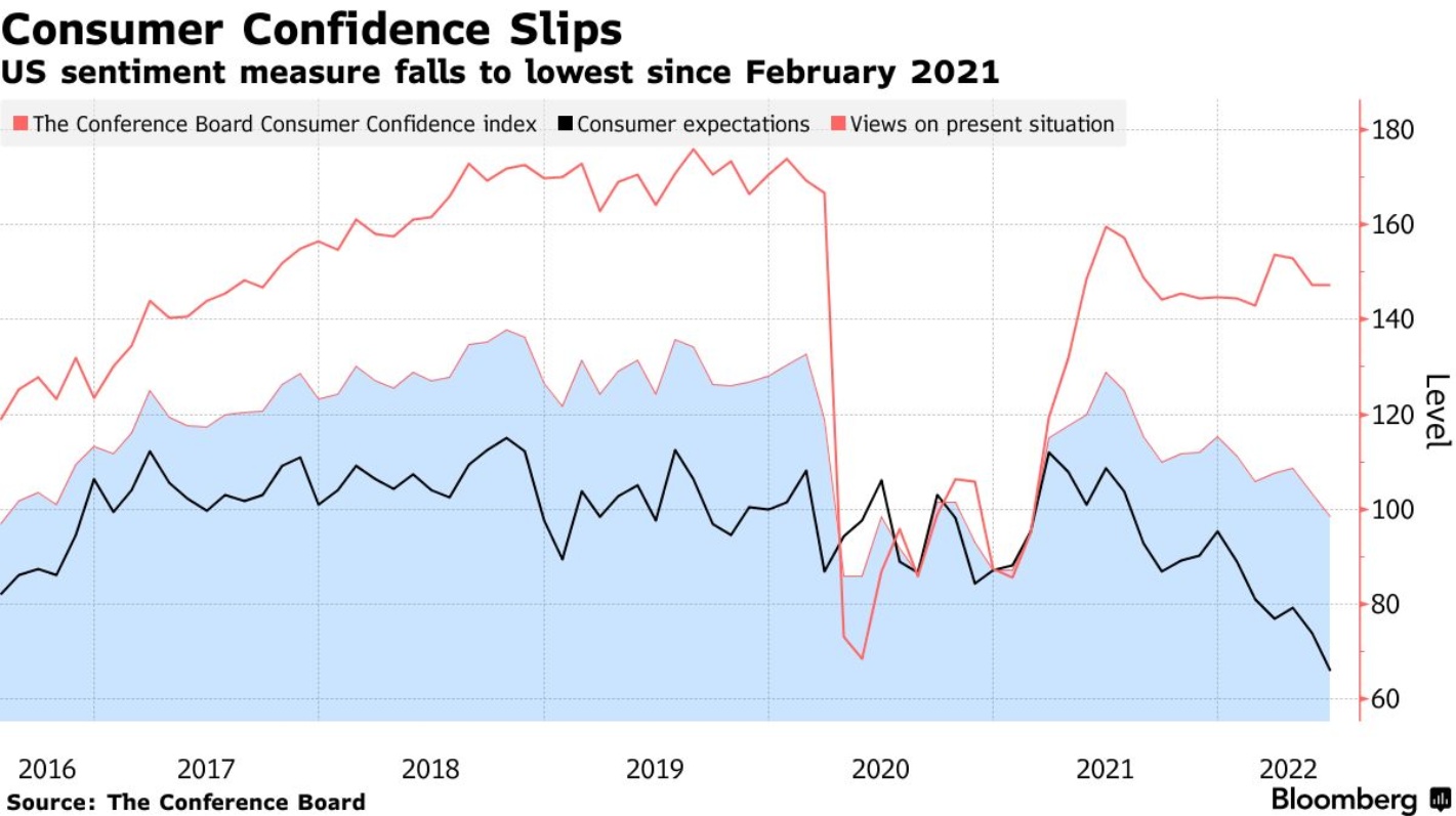 由于通货膨胀持续,美国经济前景黯淡,美国7月消费者信心下滑至2021年2月以来的最低水平。The Conference Board Index连续第三个月小幅下滑,从6月向下修正的98.4降至95.7,调查显示,预测中值为97。