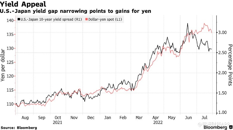 如此剧烈的走势表明,由于投资者考虑经济衰退风险可能导致主要央行加息力度减弱,今年颇受欢迎的做空日元策略可能走到了尽头。这将减轻日本央行的压力,其负利率政策导致日本与世界其他经济体之间出现巨大政策分歧,并将日元兑美元汇率推至24年来的低点。