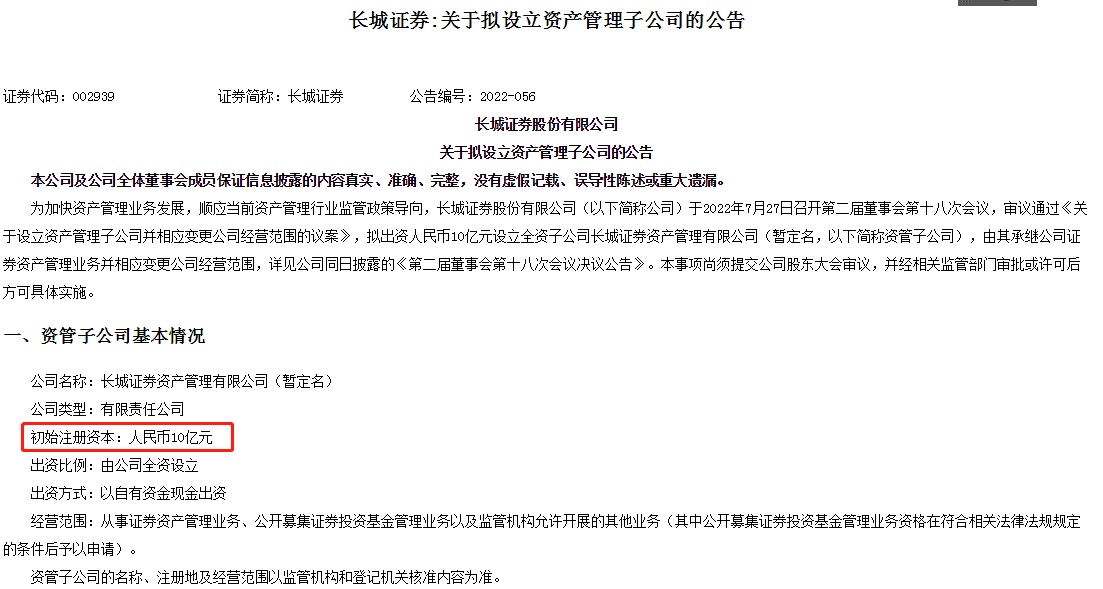 对于设立资管子公司的目的,长城证券表示,设立资管子公司有利于公司加快资产管理业务发展,顺应当前资产管理行业监管政策导向,加快财富管理转型,提高综合财富管理服务能力,进而实现“资产管理业务立足成为连接公司资金端与资产端的腰部力量,基于主动管理转型成果,成为重要的内部支撑财富管理业务的产品中心和公司对外的重要客户中心”的公司“十四五”战略规划目标。