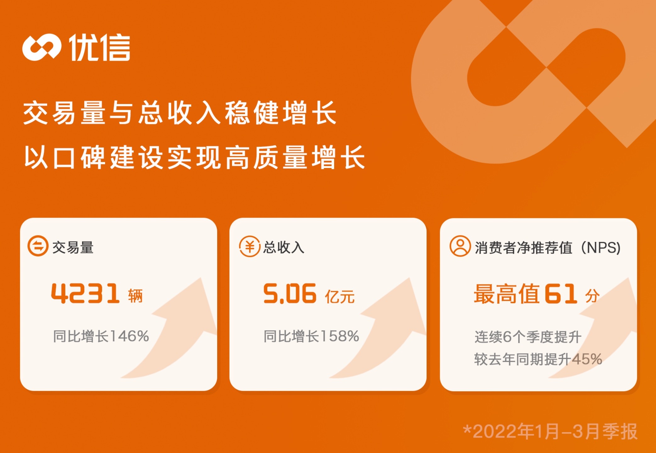 智通财经APP获悉,7月28日,中国领先的二手车在线经销商优信集团(UXIN.US)发布未经审计的2022年第一季度财务报告,总营收与交易量同比大幅度增长,NPS(顾客净推荐指数)值达到61分,再创新高。