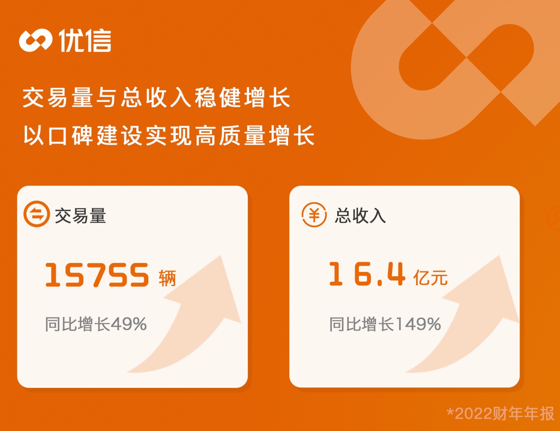 该季度财报发布后,优信2022财年年报也同时发布,在截至2022年3月31日的财年中,优信总营收为16.36亿元人民币(合2.58亿美元),较上一财年的6.57亿元人民币增长149%;该财年,优信二手车成交量为15,755辆,较上一财年的10,566辆增长49%。