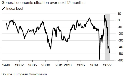 欧元区的家庭越来越担心经济前景,消费者信心跌至历史最低点。欧元区19个国家中有11个对经济即将收缩的担忧加剧,达到疫情爆发以来的最高水平。