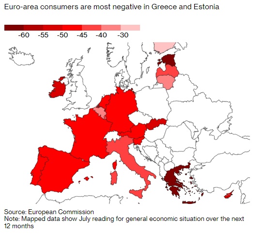 智通财经APP获悉,由于能源短缺问题困扰着消费者和企业,而欧洲央行十多年来首次加息加剧了人们对衰退即将来临的担忧,欧元区经济信心指数降至近一年半来的最低水平。欧盟委员会编制的这项指标从上个月的103.5降至7月的99,远低于经济学家预期的102。