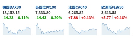 2. 截至发稿,德国DAX指数跌0.11%,英国富时100指数跌0.20%,法国CAC40指数涨0.13%,欧洲斯托克50指数涨0.16%。