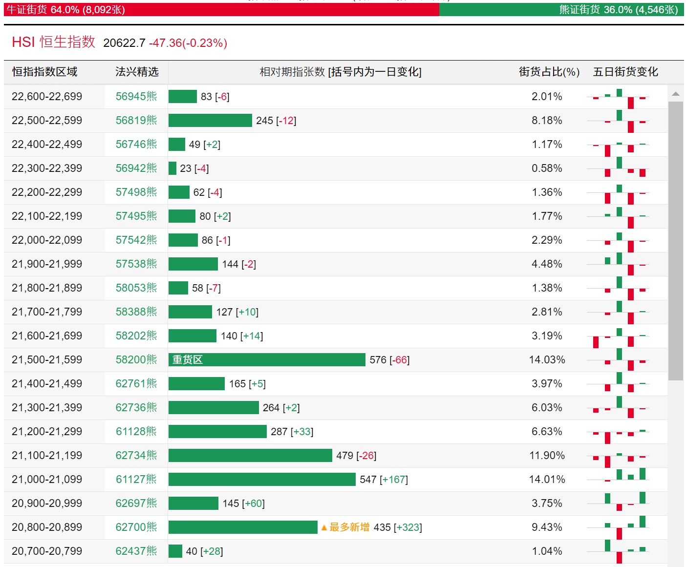 法兴恒指牛熊证街货分布图中的数据显示,熊证街货重货区在21500-21599区间,该区间最新熊证数量为576张,较上一交易日减少66张;最多新增在20800-20899区间,该区间最新熊证数量为435张,较上一交易日增加323张。