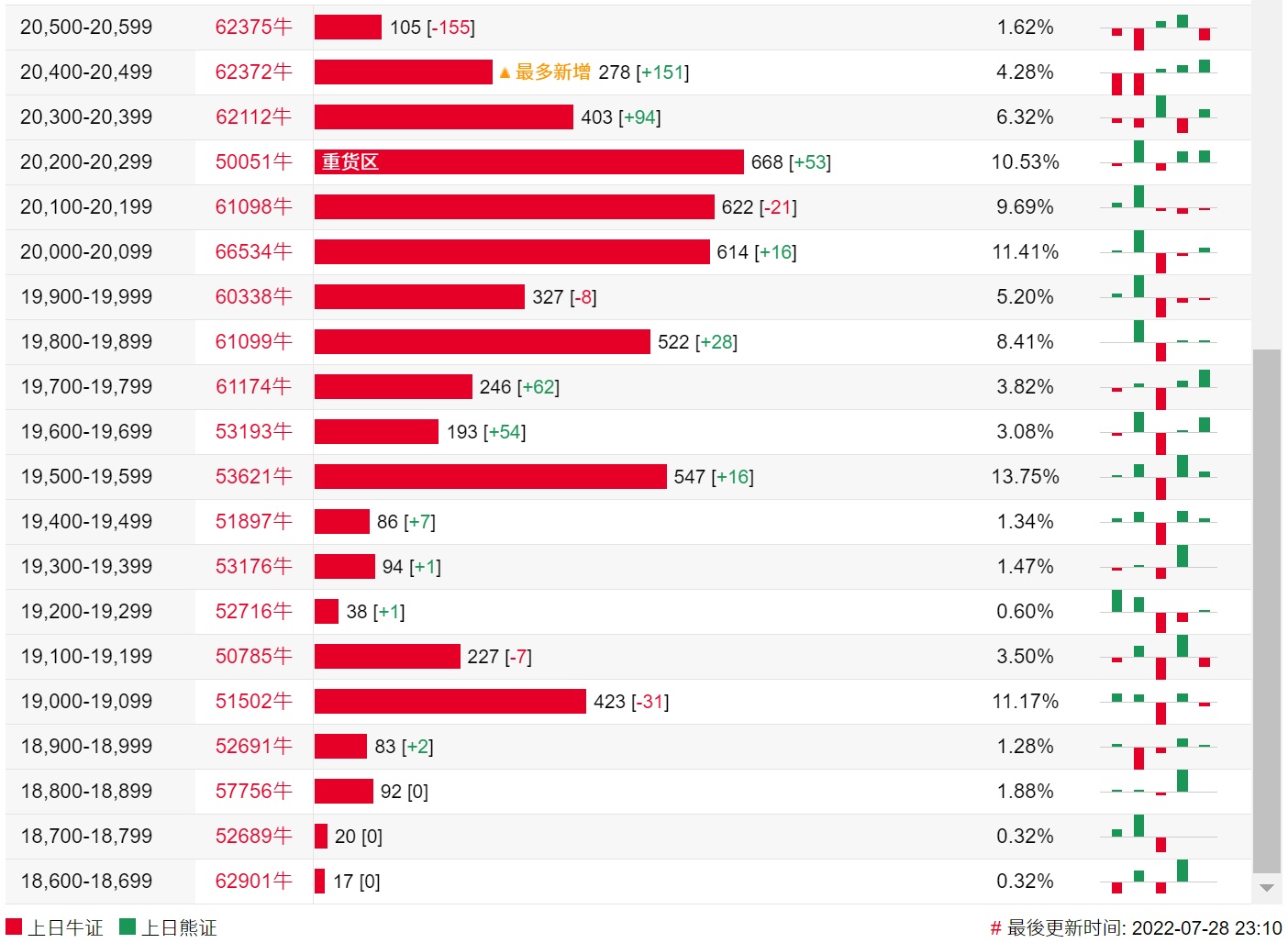 牛证街货重货区在20200-20299区间,该区间最新牛证数量为668张,较上一交易日增加53张;最多新增在20400-20499区间,该区间最新牛证数量为278张,较上一交易日增加151张。