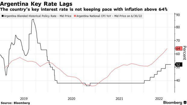 由于关键利率落后于预计7月份将达到的70%年化通胀率,市场一直呼吁阿根廷央行收紧货币政策。自阿根廷经济部长马丁·古斯曼本月初辞职以来,阿根廷的消费价格上涨速度加快,在引发政局动荡之时令外界对国际货币基金组织(IMF)一项440亿美元计划的未来产生了疑问。该计划要求阿根廷关键利率超过年化通胀率,并为国际储备设定增长目标。由于阿根廷人继续从银行账户提取美元,该国国际储备本月有所减少。