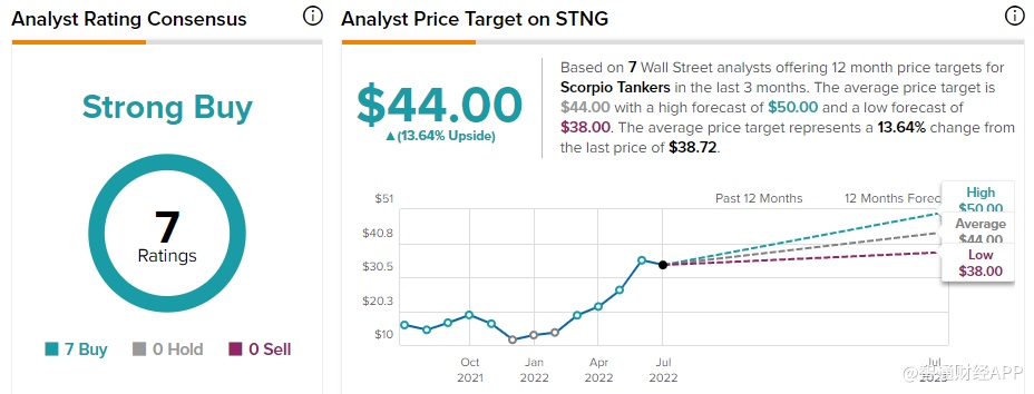 根据研究机构Tipranks的数据,近期有7位分析师予天蝎油轮“买入”评级,没有分析师予“持有”或“卖出”评级,共识评级为“强力买入”,平均目标价为44美元,较当前水平有13.64%的上涨空间。