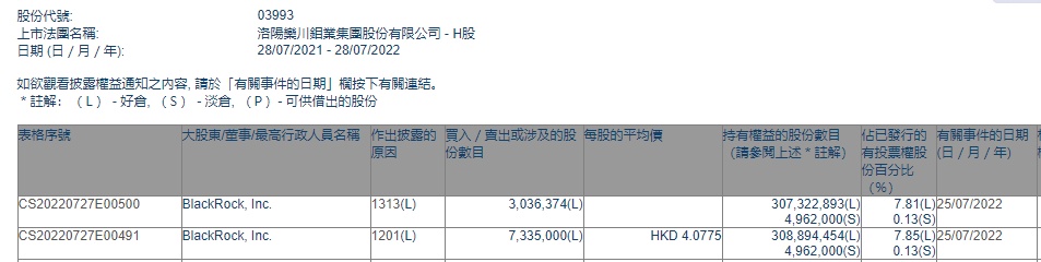 智通财经APP获悉,香港联交所最新资料显示,7月25日,贝莱德减持洛阳钼业(03993)733.5万股,每股作价4.0775港元,总金额约为2990.85万港元。减持后最新持股数目约为3.09亿股,最新持股比例为7.85%。