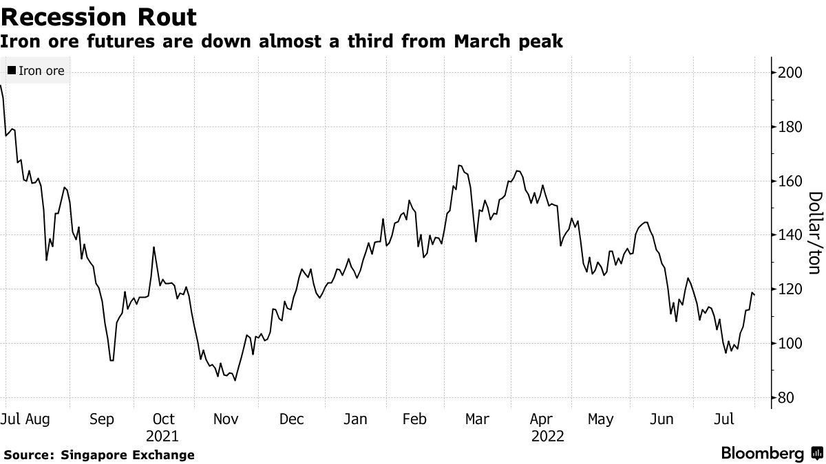 矿业公司正在经历一场财富剧变。之前大宗商品价格飙升推高了矿业公司利润率,但随着金属价格暴跌与通胀飙升,以及挥之不去的经营和物流挑战相互碰撞,利润率如今受到挤压。虽然铁矿石期货价格在过去一周左右有所回升,但仍较3月份的峰值下跌约三分之一,主要原因是新冠疫情卷土重来和房地产市场陷入低迷加剧了人们对经济衰退的担忧。