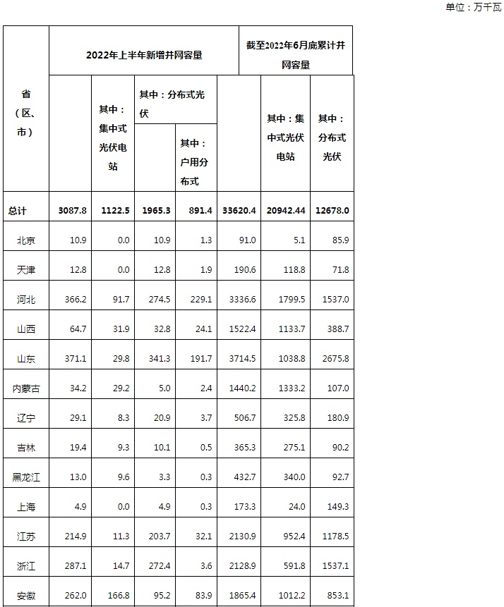 智通财经APP获悉,7月29日,国家能源局公布2022年上半年光伏发电建设运行情况,2022年上半年新增并网容量3087.8万千瓦,其中集中式光伏电站新增并网容量1122.5万千瓦,分布式光伏1965.3万千瓦。截至2022年6月底累计并网容量33620.4万千瓦。