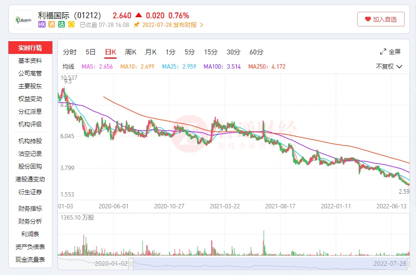 用江河日下形容利福国际(01212)近两年的股价走势,再贴切不过了。2020年以来,该公司股价从9.5港元跌至2.6港元,跌幅约73%。股价断崖下跌背后,业绩羸弱可见一斑。