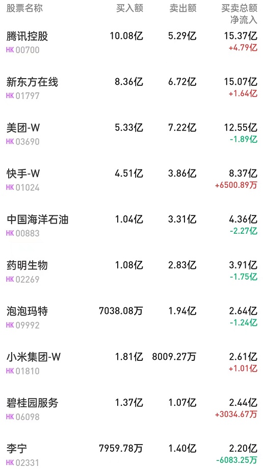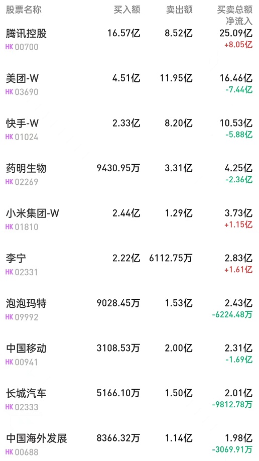 腾讯(00700)获净买入12.83亿港元。消息面上,据新华社报道,中共中央政治局7月28日召开会议,关于平台经济,会议再次强调“要推动平台经济规范健康持续发展,完成平台经济专项整改,对平台经济实施常态化监管”,并首次提出“集中推出一批‘绿灯’投资案例”。光大证券发布研究报告称,政策利好市场预期转暖,互联网板块估值有望持续修复,利好头部互联网企业。推荐腾讯控股等。